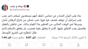 ودعا ترمب حكومة الاحتلال إلى “وقف فوري لقصف غزة” من أجل ضمان إخراج الأسرى بأمان وسرعة، مشددًا على أن المسألة “لا تتعلق بغزة وحدها بل بالسلام الذي طال انتظاره في الشرق الأوسط”.