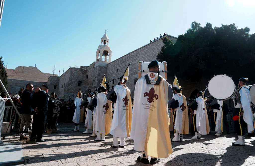 وتجلت مظاهر الفرح مع دخول الفرق الكشفية إلى ساحة المهد، قبيل استقبال موكب بطريرك القدس للاتين الكاردينال بيير باتيستا بيتسابالا بحضور رشمي وشعبي فلسطيني.