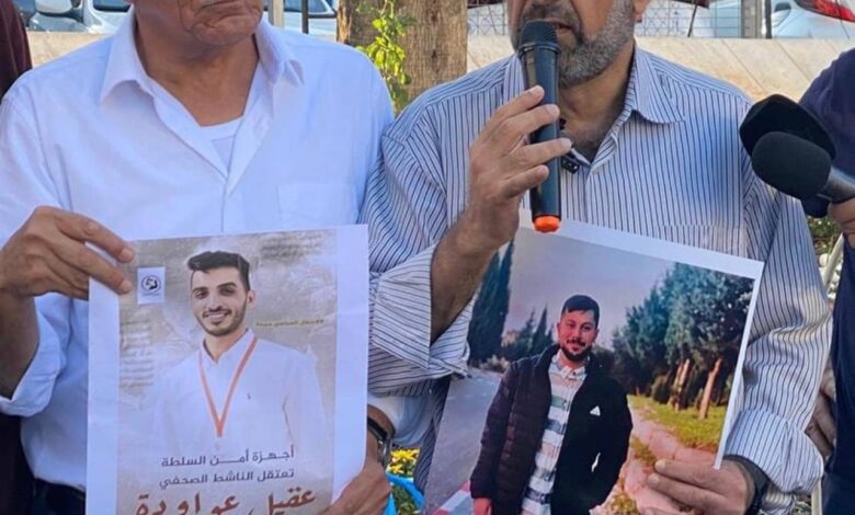 ورفع المشاركون صور المعتقلين السياسيين، مطالبين بالافراج الفوري عنهم، وعلى رأسهم الصحفي عقيل عواودة ورئيس مجلس طلبة جامعة بير زيت عبد المجيد حسن.