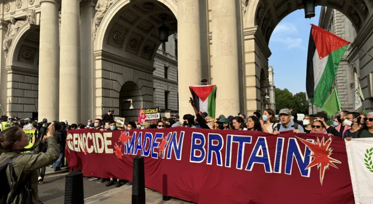 وعطّل ما يصل إلى 300 شخص الوصول إلى وزارة الخارجية صباح الأربعاء مع لافتة كبيرة تقول: “الإبادة الجماعية صنعت في بريطانيا”.